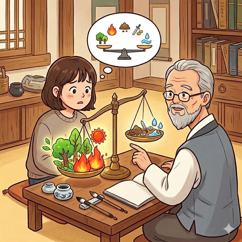 같은 화라도 누구에게는 추진력이 되고, 누구에게는 과열이 될 수 있습니다. 같은 수의 부족도 어떤 사람에게는 답답함으로 보일 수 있고, 또 어떤 사람에게는 단순하고 빠른 판단으로 나타날 수 있습니다. 그래서 사주에서는 오행 하나만 따로 떼어 보기보다 전체적인 어울림 속에서 해석하는 것이 중요합니다.