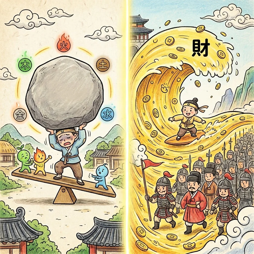 즉 일반 명식은 균형을 맞추는 쪽으로 보고, 종격은 이미 강한 한편에 붙은 상태가 유지되는지를 더 중요하게 봅니다.